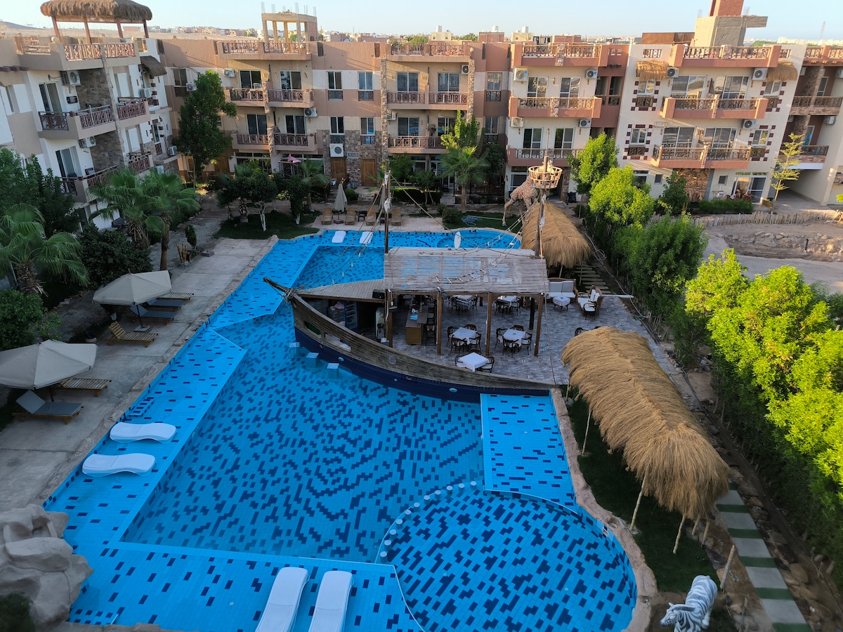 Indulge in comfort and privacy at one of the most beautiful resorts in Hurghada A brand new, modern and fully equipped studio, at The View Resort, Hurghada. The perfect place to spend a quiet and relaxing holiday where you wake up to the sounds of seagulls, overlook the beautiful sea and the wonderful swimming pool and enjoy spending a wonderful time in the private gardens of the complex. The studio suitable for a small family or two guests Guests have free access to the swimming pool and beach