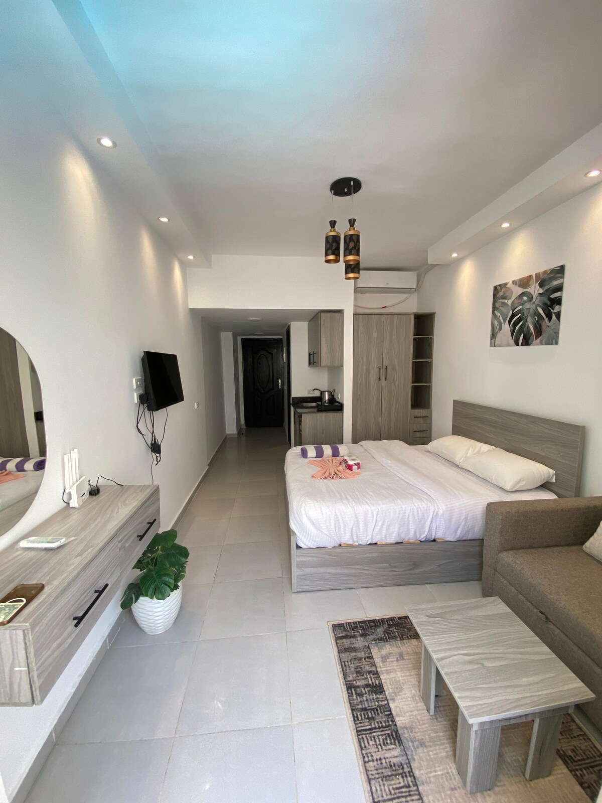 Modernes Apartment direkt in der Hurghada Marina. 2 Schlafzimmer, voll ausgestattete Küche, Smart-TV, schnelles WLAN und AC in allen Räumen. Das Highlight: riesige private Rooftop-Terrasse mit Meerblick. Perfekt für Kaffee am Morgen, Sonnenuntergang oder Remote Work. Restaurants, Cafés, Bars und Strand nur wenige Schritte entfernt. Ideal für Paare, Freunde und Geschäftsreisende