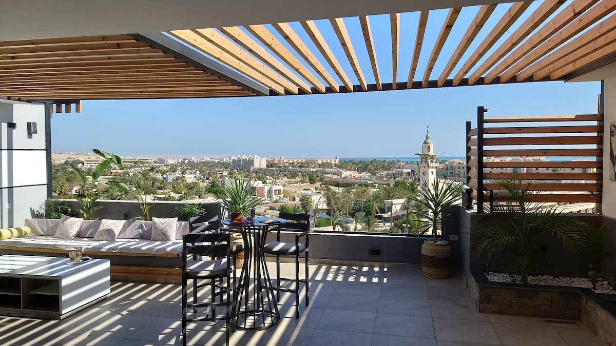 Wake up to breathtaking ocean views and the soothing sound of waves in our elegantly designed beachfront apartment. 🌊✨ Located in the heart of Hurghada, this stylish retreat offers high-end furnishings, calming interiors, and modern amenities for a truly relaxing stay. Enjoy stunning views of the beach. vibrant city life and top attractions—all just moments away! 🏖️🌇