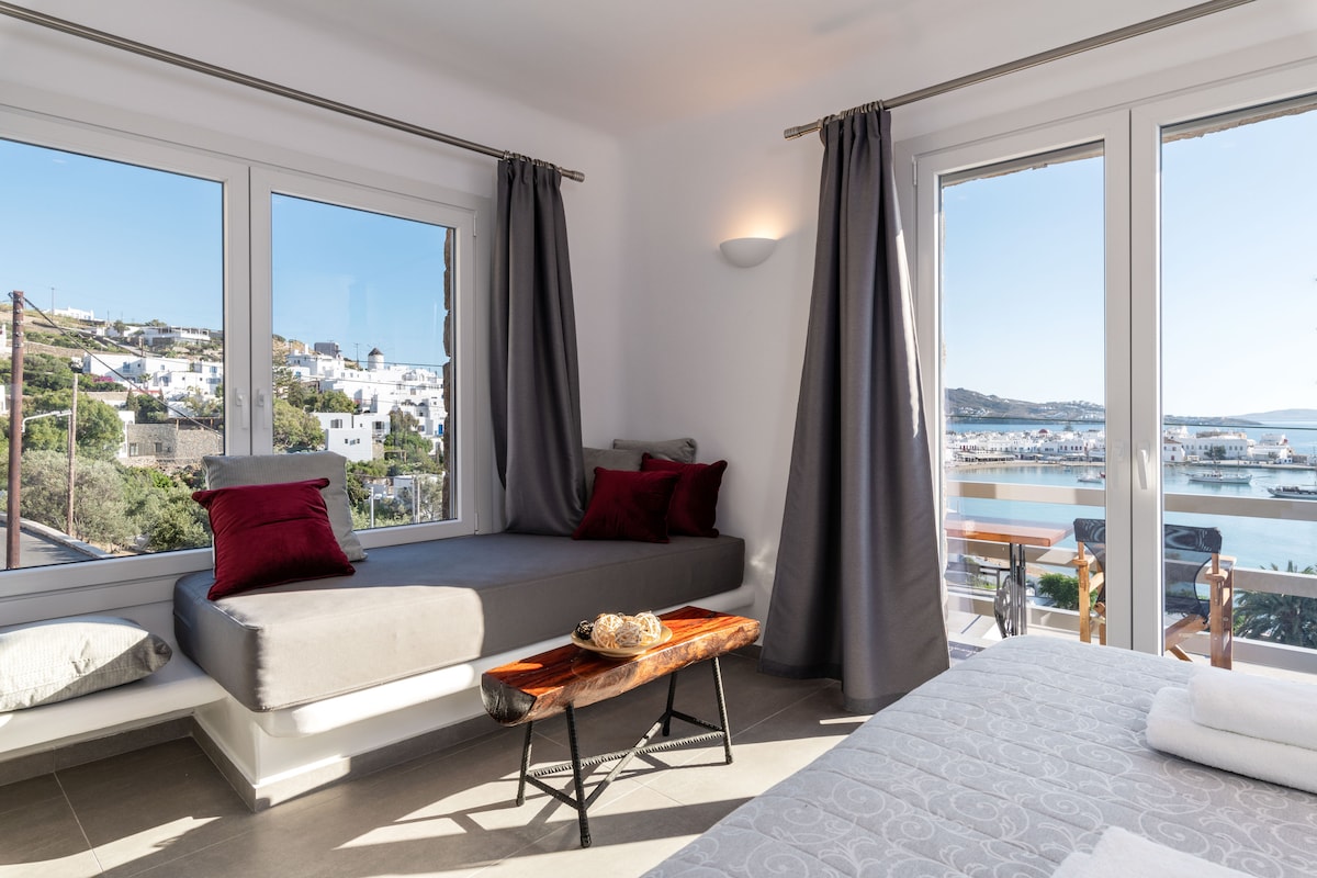 Enjoy Aegean sea views from stylish Deluxe Suite in Mykonos Town ("Legends in Town"). Designed by award-winning architect. Have a sip of wine at Private terrace with jacuzzi during the sunset. Relax on King bed with a high-quality mattress. Explore Mykonos town restaurants and boutiques within a short walk Highlights: * Stylish Sea Views * Jacuzzi on the Terrace * King Bed, High-Quality Mattress * Central but Quiet * Beautiful sunsets
