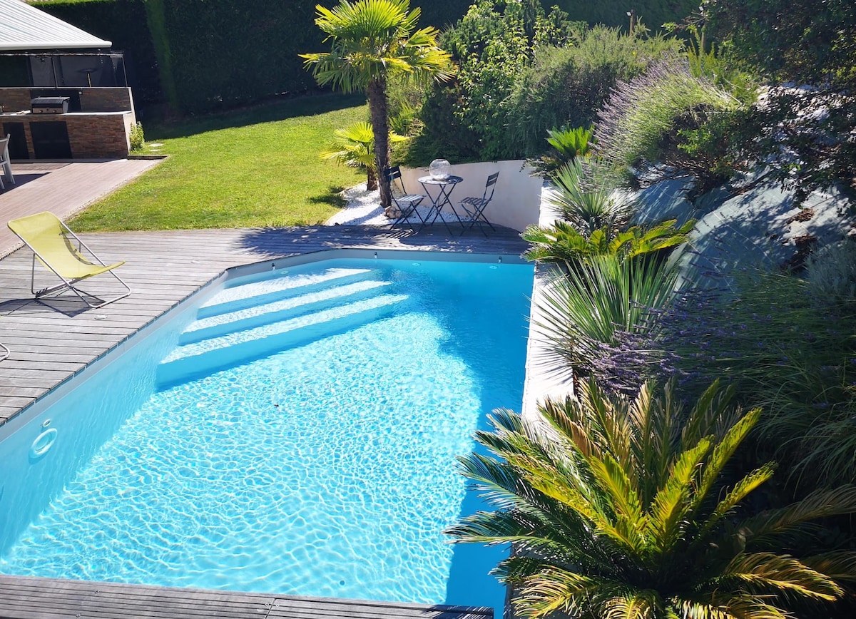 别墅配备恒温游泳池、烤肉架和法式滚球