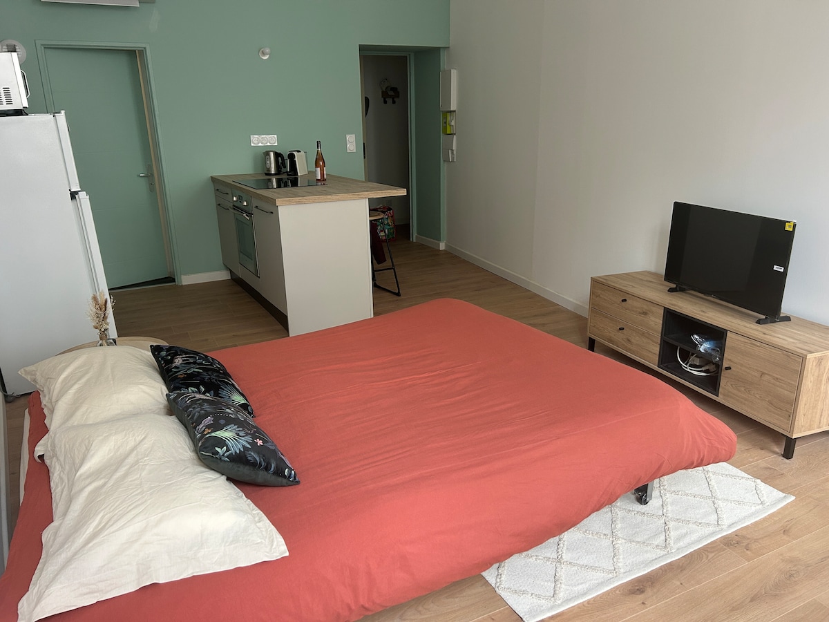 Détendez-vous dans ce logement climatisé, de plein pied, calme et élégant. Entrée indépendante en autonomie. Ce studio, aux équipements modernes sera votre bulle de repos. Grande douche carrelée, kitchenette + vitro-céramique, frigo, placard et penderie vous rendra le séjour agréable. Les volets roulants automatiques, les moustiquaires intégrées et le ventilateur central augmenteront votre bien être. Voiture, motos, vélos dans la cour sécurisée, prise électrique pour recharger batteries vélos.