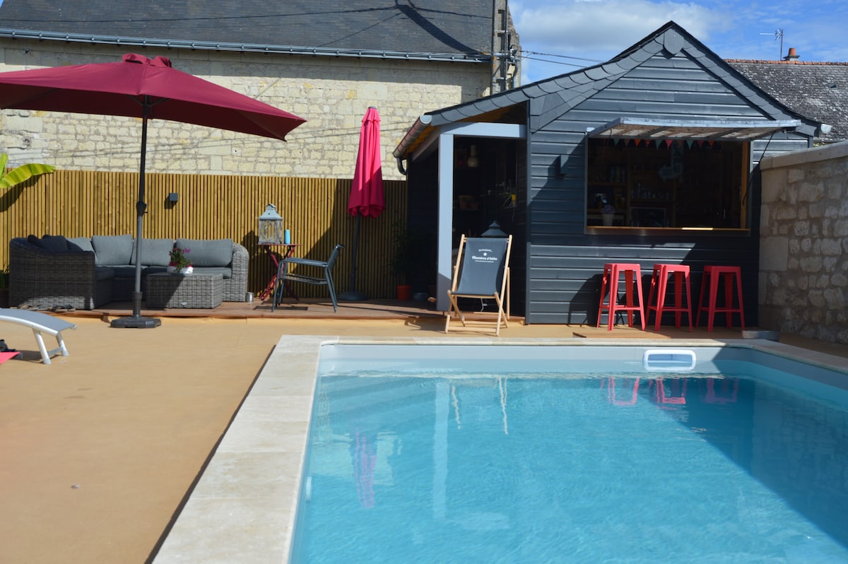 Au cœur du Val de Loire, de ses Châteaux, entre BOURGUEIL, CHINON, LANGEAIS, en plein vignoble de Touraine sur le « Chemin de St Martin », en bordure de l’itinéraire « La Loire à Vélos », vous apprécierez cette belle propriété de charme située à 300 m du fleuve et à deux pas du péage de l'A85. Votre chambre est accessible par escalier extérieur indépendant, dans une jolie "longère" d'époque. Votre petit déjeuner INCLUS sera servi à l’heure désirée sous la Tonnelle ou dans la Serre suivant météo.