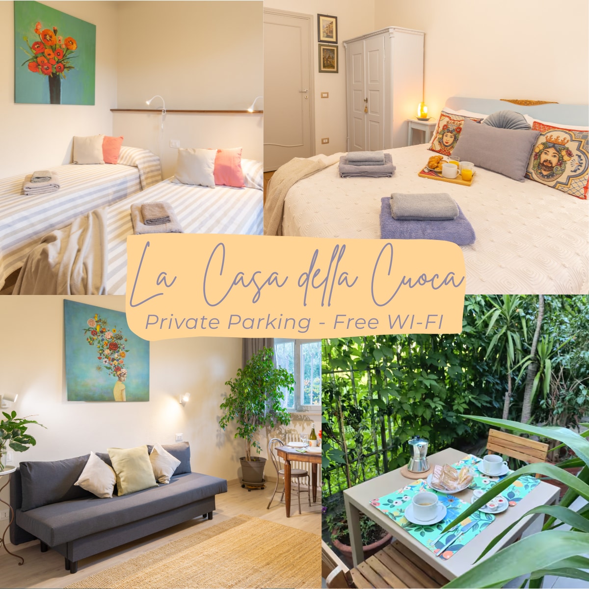 Luminoso e accogliente appartamento ristrutturato recentemente al quarto piano di elegante condominio con ascensore. Posto in un quartiere tranquillo con tutti i servizi (Bar, Ristoranti, Pizzeria, Farmacia, Supermercato e Parco giochi per bambini) e’ a soli 5 minuti di cammino dall’Aeroporto e 10 minuti dalla Stazione Centrale e dal Centro Storico.