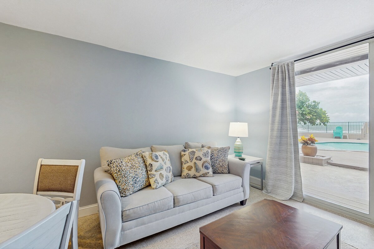 Welcome to the Flamingo Suite, our renovated Bayview condo with a panoramic view of the water! Sitting on the 3rd floor with a private balcony, the Flamingo 🦩is your perfect romantic getaway or family vacation spot. Quiet, amazing sunset views, dolphin spotting, with in-suite entertainment and even a walk-in shower! You also get to enjoy the resort amenities including a year-round HEATED POOL, bar & grill on the water, convenience store on the 2nd floor, 24/7 security, and FREE parking & wifi!