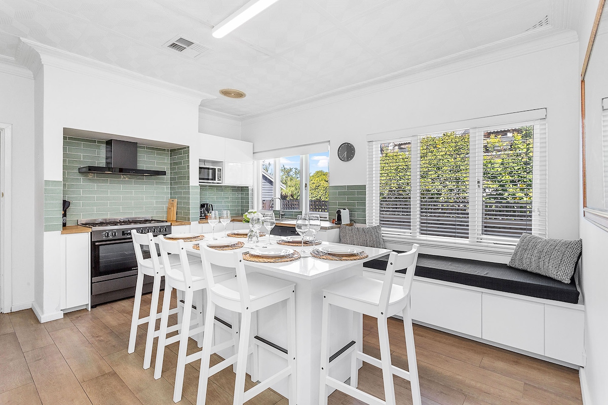 Enjoy a stylish family friendly experience at this centrally located place. Walking distance to train station, cafe & shops. Three bedroom, two bathroom, open plan living, laundry with washing machine, clothes dryer, reverse cycle aircon & bbq. Fully furnished house with full linen, towels, kitchen equipment. Sleeps 6 Adults/Children in 3 x Queen/Double beds plus cott, baby bath, play matt, high chair, new born seat. Secure parking suitable for family or business stays.