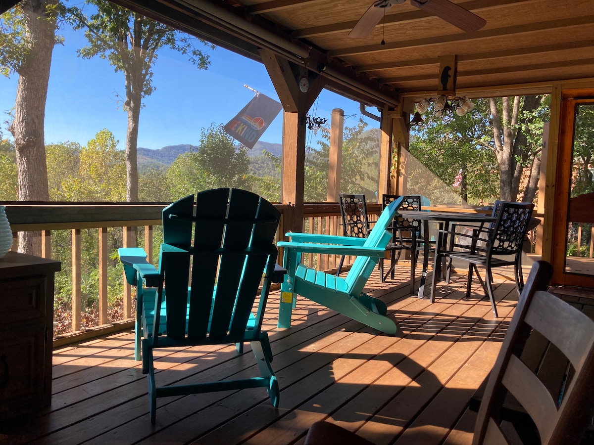 Set on a ridge with views of Brasstown Bald & surrounding mountains, this cabin is ideal for a relaxing romantic retreat or family getaway. Outside is an expansive deck engulfed in rhododendrons & mountain laurel, chiminea for evening fires, gas grill on the covered deck area, & wood stove inside for cold nights. The custom dining table in the center of the cabin designed for gathering. Minutes to Lake Chatuge, downtown Hiawassee, hiking & wineries. find us online @ridgetopcabin. See FAQs below.