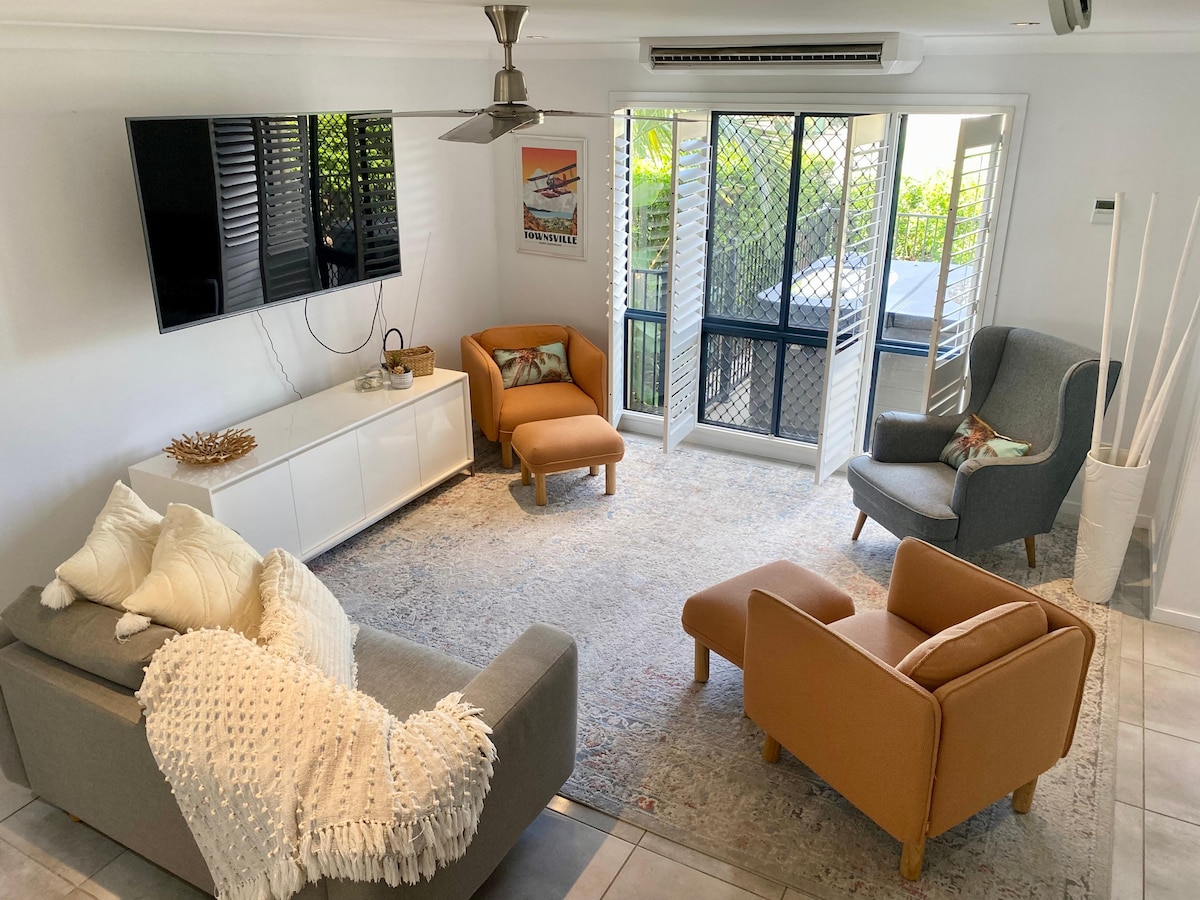 Quiet unit in multi unit dwelling. 3 bedrooms 1 King Single & 1 Single bedrooms with partion wall and shared aircon. 1 large Queen bedroom with aircon. Lounge has aircon. Kitchen, toilet and bathroom. Only 1 car parking for the unit on premise. Walk to all conveniences and attractions. Cycle to JCU and hospital. Bus 200 at door connecting to Bus Interchange, ferry, JCU, Hospital, Stockland. Beautiful riverfront across road with cycle and walkways.