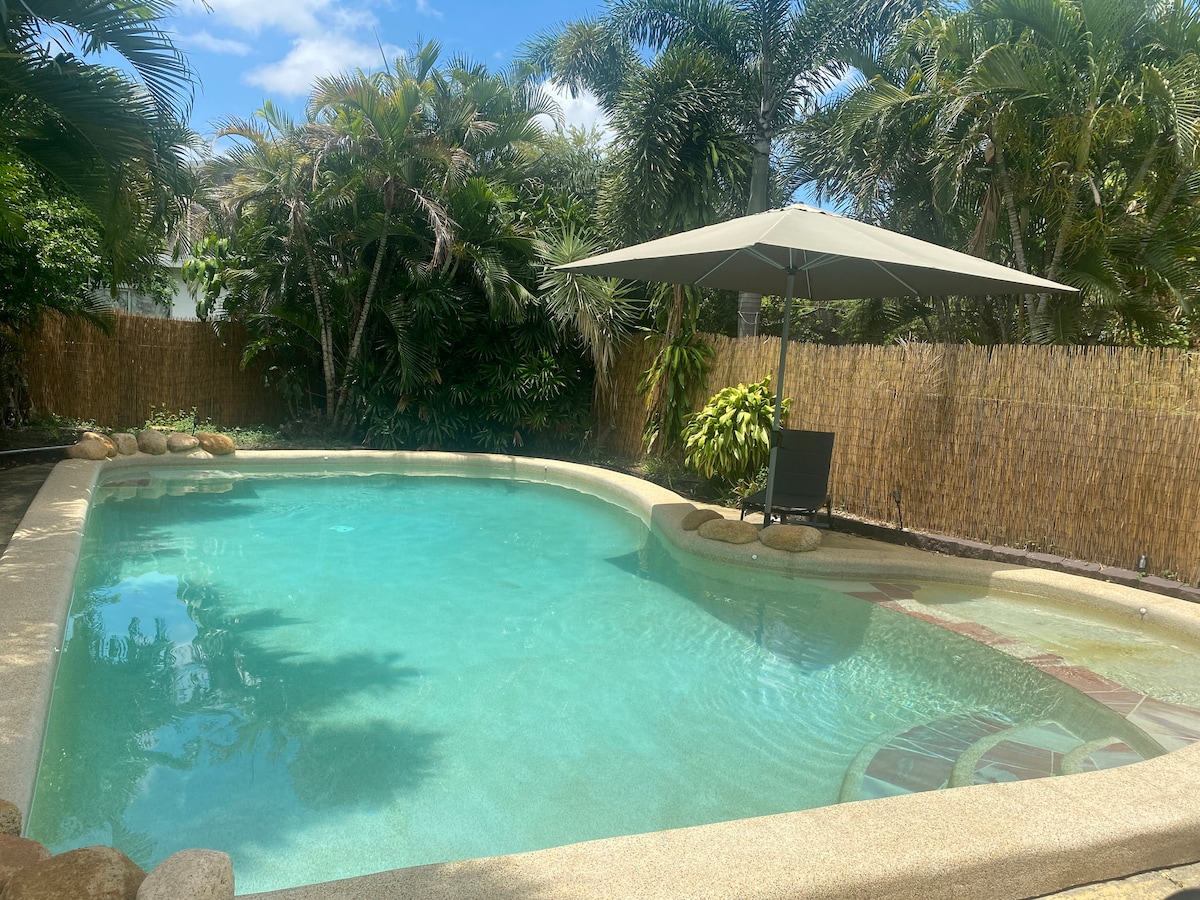 Relax and unwind in this fully self contained and air conditioned guest house nestled in tropical gardens, with large pool. Thoughtfully furnished, decorated and stocked to ensure your stay is amazing. 20 minutes from the city, university, hospital, The Strand, Murray Sporting Complex and the NRL stadium, with the award winning "Billabong Sanctuary" down the road. Your own transport is recommended. Our home is on the same property, so here if you need us, but your privacy is respected.