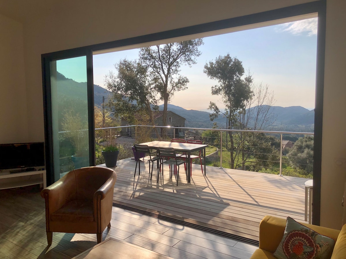 Vous aimez la mer, la montagne, les beaux paysages, les belles randonnées, et vous aimez aussi l'authenticité et vous retrouver au calme en pleine nature ? Venez nous découvrir ! Notre appartement est situé à 20 km de Porto Vecchio, en Corse-du-Sud, à Conca, village d'arrivée du mythique GR20 et à 15 min des plages. Sur les hauteurs du village, face à la montagne, nous vous proposons de venir séjourner entre terre et mer dans notre appartement neuf indépendant chez l'habitant de 38m2.