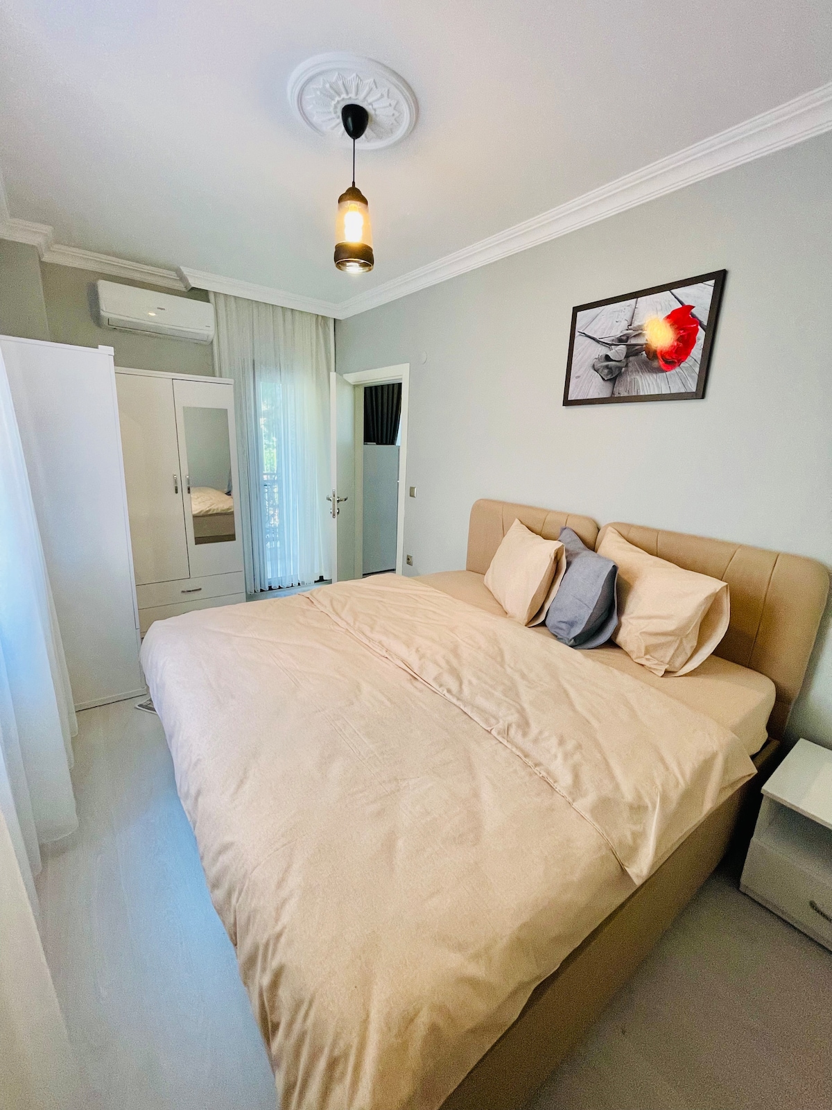 Yeni yapmış olduğumuz bu dairelerde her şey sıfır kullanılmamış sizleri kendi evinizde hissettirecek kadar huzurlu bir ortam.Siz değerli misafirlerimizi aramızda görmekten mutluluk duyarız.Konumumuz gereğince şehir merkezi olup cevresinde bir çok market ve cafe restaurantlar bulundurmaktadır.Havalanına yürüme mesafesindedir.İyi günler.