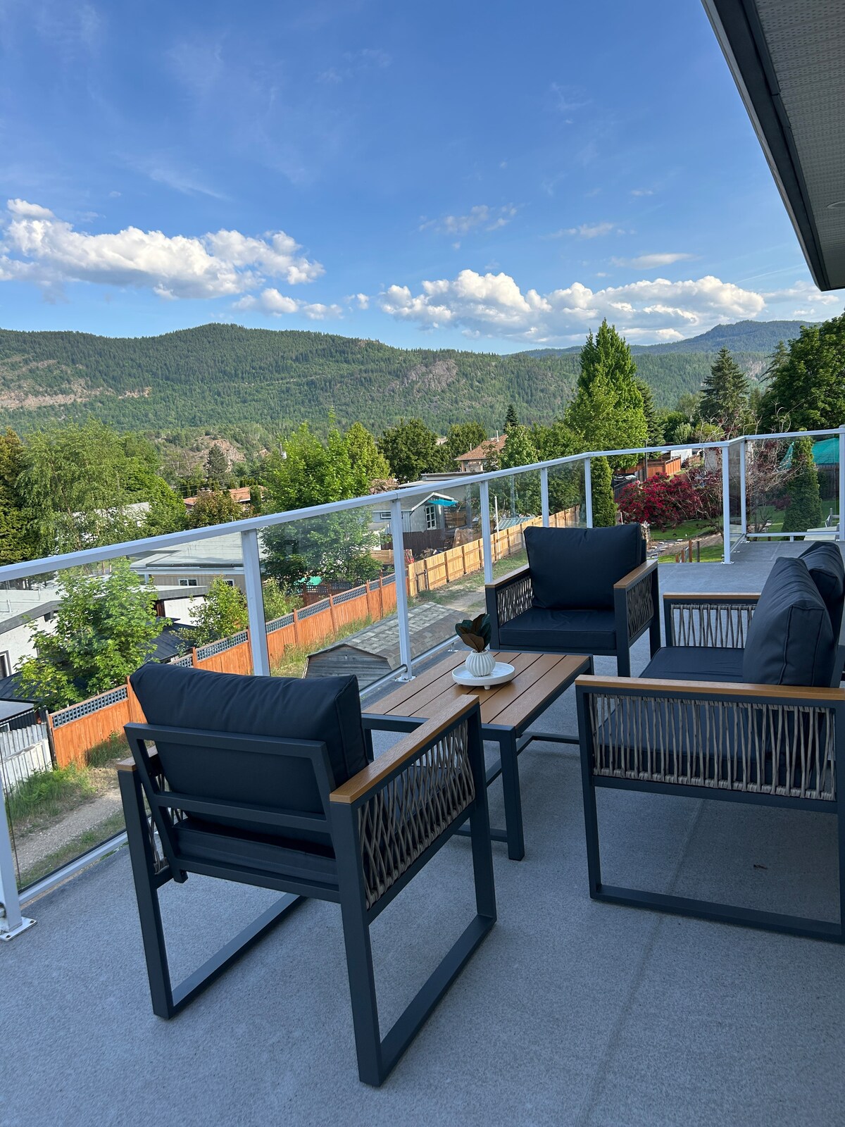Our beautiful 1100 sq.ft executive 2 bedroom suite boasts exceptional unobstructed views of the Kootenays. The 800 sq.ft private deck provides a place to enjoy the sensational sunrises and a BBQ to prepare meals at sunset. Gourmet kitchen contains everything you need, or we are just a short 5 minute walk to town. Off street parking, separate entrance with keypad, and laundry included. Guests have access to a ski locker at Red Mountain and secure bike storage on the premises.