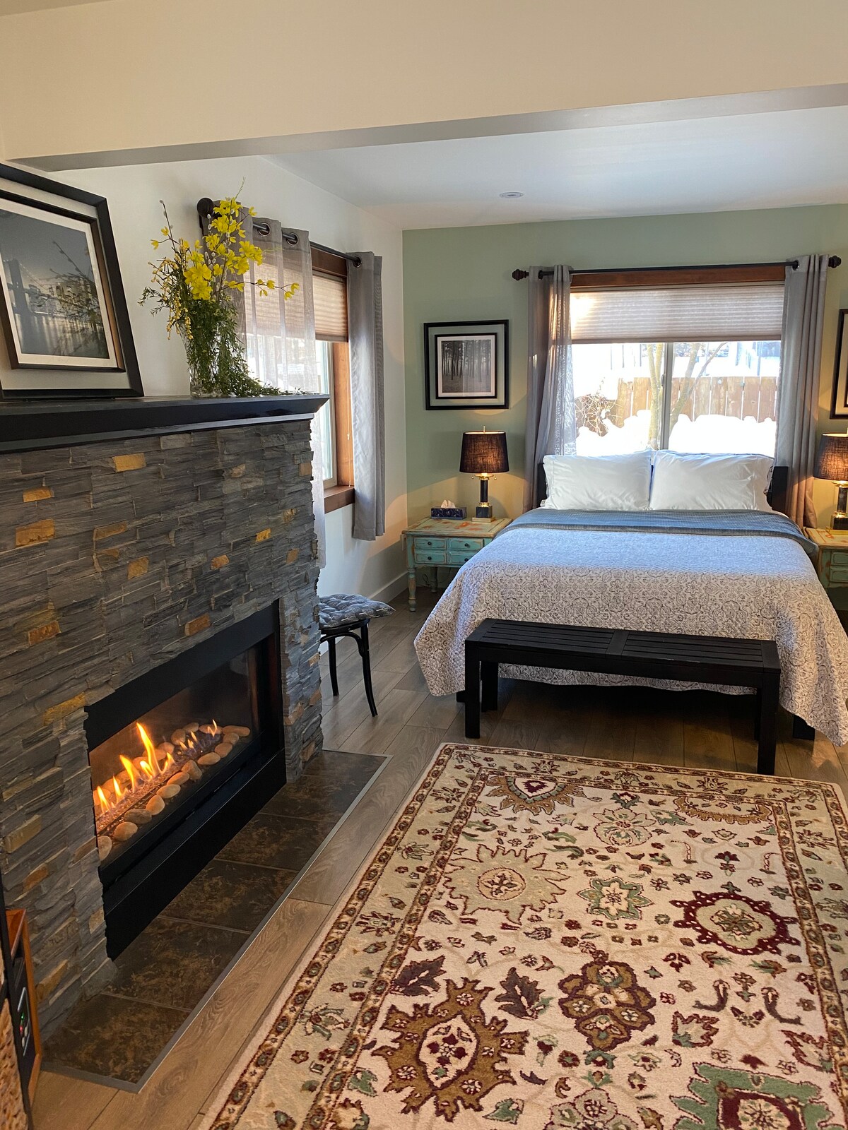 Quiet, comfortable large studio with dream bed, cozy gas fireplace and a spacious beautiful kitchen. Private covered entrance and lots of storage for golf clubs, bikes and skis/boards. In suite washer/dryer. Conveniently located 3 blocks from downtown shopping and restaurants. Quick access to all outdoor activities. In the winter a free shuttle to Red Mountain stops in front of house. In town for work or longer stay? Inquire for excellent mid-term rates. 4962.