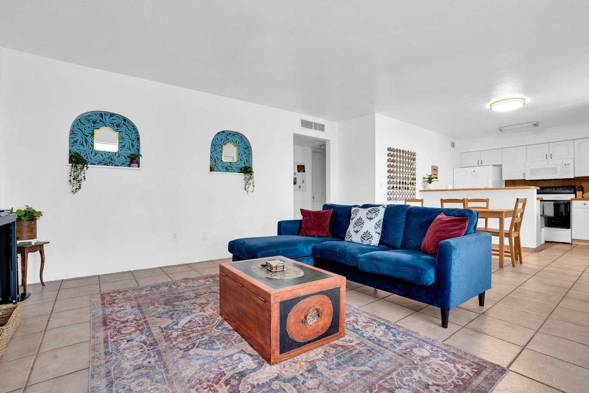 Bright, charming, pool-side, attached guest house with private entrance. The home features exposed brick walls, large windows, authentic Saltillo tile floors, and tasteful midcentury modern furnishing and décor throughout. It comes with all the amenities to make your stay comfortable: a dine-in kitchenette, private bathroom, covered parking, laundry room, Hayneedle king-sized bed (plus a couch bed in the living room), 40” TV, and plenty of space to spread out and make yourself at home.
