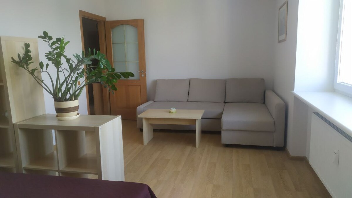 This cozy apartment with nice space and a practical layout for two. Windows fill it with natural light, and a private balcony invites you to enjoy quiet evenings or breakfast outdoors. A comfy bed, fully equipped kitchen, modern bathroom, and washing machine provide everyday comfort. Neutral tones and subtle décor create a pleasant atmosphere for relaxing or staying while visiting Trakai.