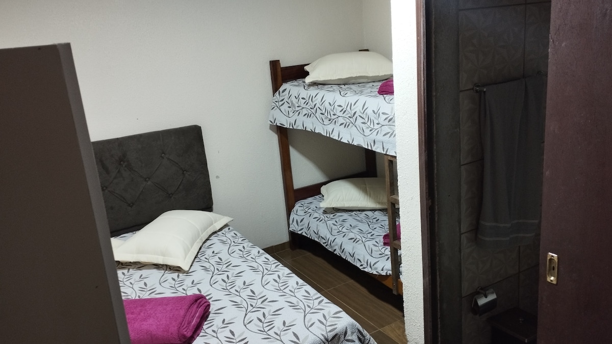 Quarto em pousada com banheiro privativo para até 4 pessoas. O quarto conta com ventilador, roupas de cama, travesseiros, cobertores e toalhas.
