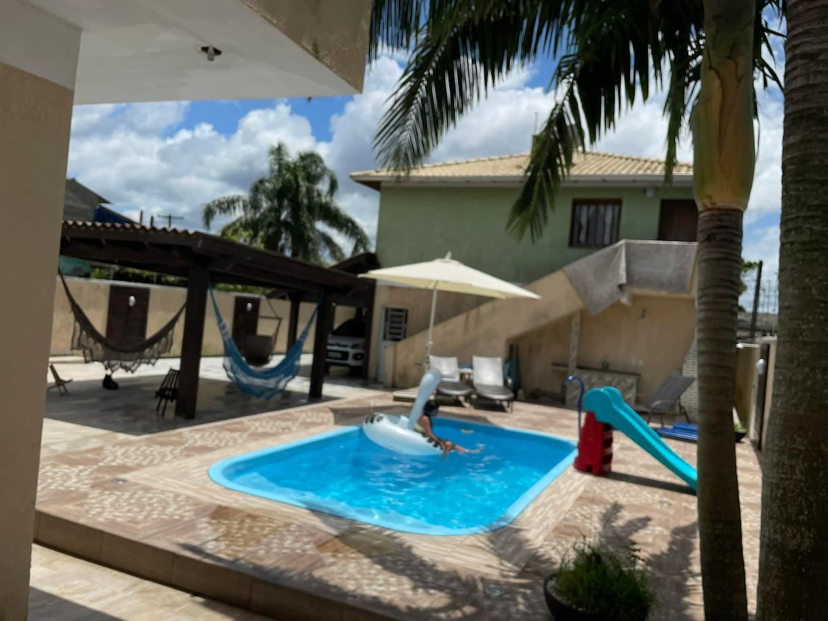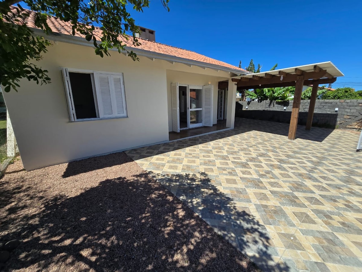 Casa entre centro e mar , com piscina e espaço para toda a família . Pertinho de mercado e conveniência. Ideal para relaxar e curtir a natureza . 🍃 🌳 🌲 Possui pátio fechado, piscina, sala e cozinha conceito aberto, dois quartos e um anexo para meditar ou relaxar ! A praia está aproximadamente 15min a pé, mercado, padaria e açougue em uma quadra ! Super bem localizado !!