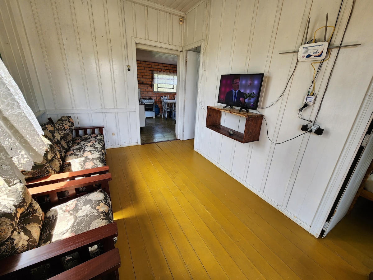 Uma casa inteira dois quartos, sala, cozinha , banheiro e área com rede. Churrasqueira, estacionamento para um carro. Wifi rápido, TV Smart de 43 pl, forno elétrico, microondas, chaleira elétrica, cafeteira, torradeira , batedeira, liquidificador, travessas de vidro, copos , 9 taças, pratos, talheres, panelas, canecas, etc... OBSERVAÇÃO: No terreno tem 2 casas, alugamos a da frente e mora nos fundos o casal de anfitriões. patios separados, portão da frente compartilhado.