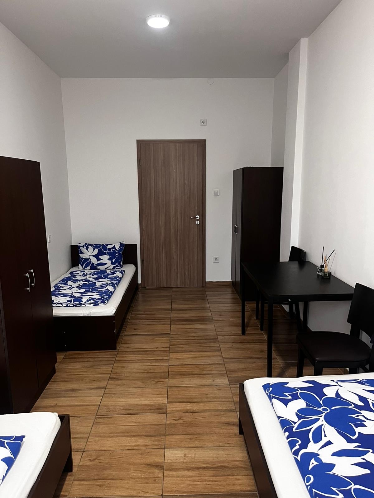 Diese Wohneinheit befindet sich im Souterrain. Zimmer mit 2 Schlafzimmern: 1 Raum mit Doppelbett 1 Raum mit Einzelbett Ein eigenes Bad mit WC befindet sich separat gleich gegenüber des Zimmers. Ebenfalls eine Tür weiter befindet sich die große Gemeinschaftsküche mit Esstischen, Waschmaschine und allen Küchengeräten.