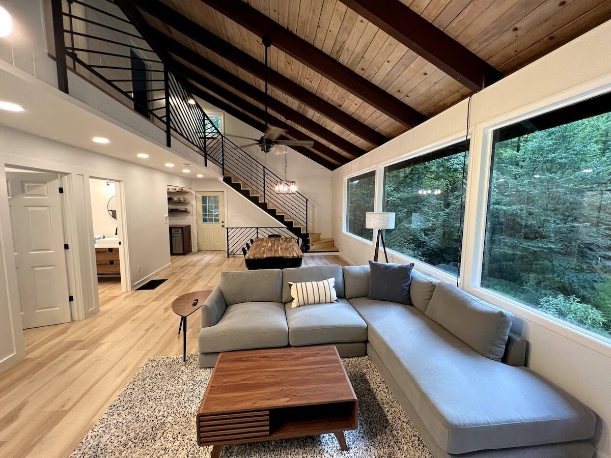 Welcome to your dream mountain escape—a secluded treetop cabin with jaw-dropping 180° mountain views just 10 minutes above downtown Brevard, NC! This modern-rustic A-frame offers the best of both worlds—peaceful seclusion + easy access to shops, dining, Pisgah National Forest, and Bracken Mountain Preserve trails (a short walk away). Sip coffee at sunrise or wind down with wine on the wraparound deck, this cozy retreat is the perfect base camp for your Blue Ridge adventure. 📸 @BrevardNCcabin