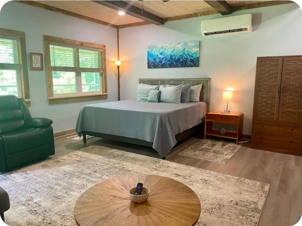 Cozy Riverside Camping Cabin in Pisgah Natl.Forest A laid-back spot to unplug and enjoy nature without breaking the bank. This simple camping cabin sits right on the river in beautiful Pisgah Natl.Forest. It’s got the basics: real beds, electric, small fridge, heat & AC, a fire ring, charcoal grill, and a deck to enjoy the view. This is a CAMPING STYLE CABIN, so there’s NO indoor plumbing-don't worry the bathhouse is a short walk away. Bring your own beddings and pile in!