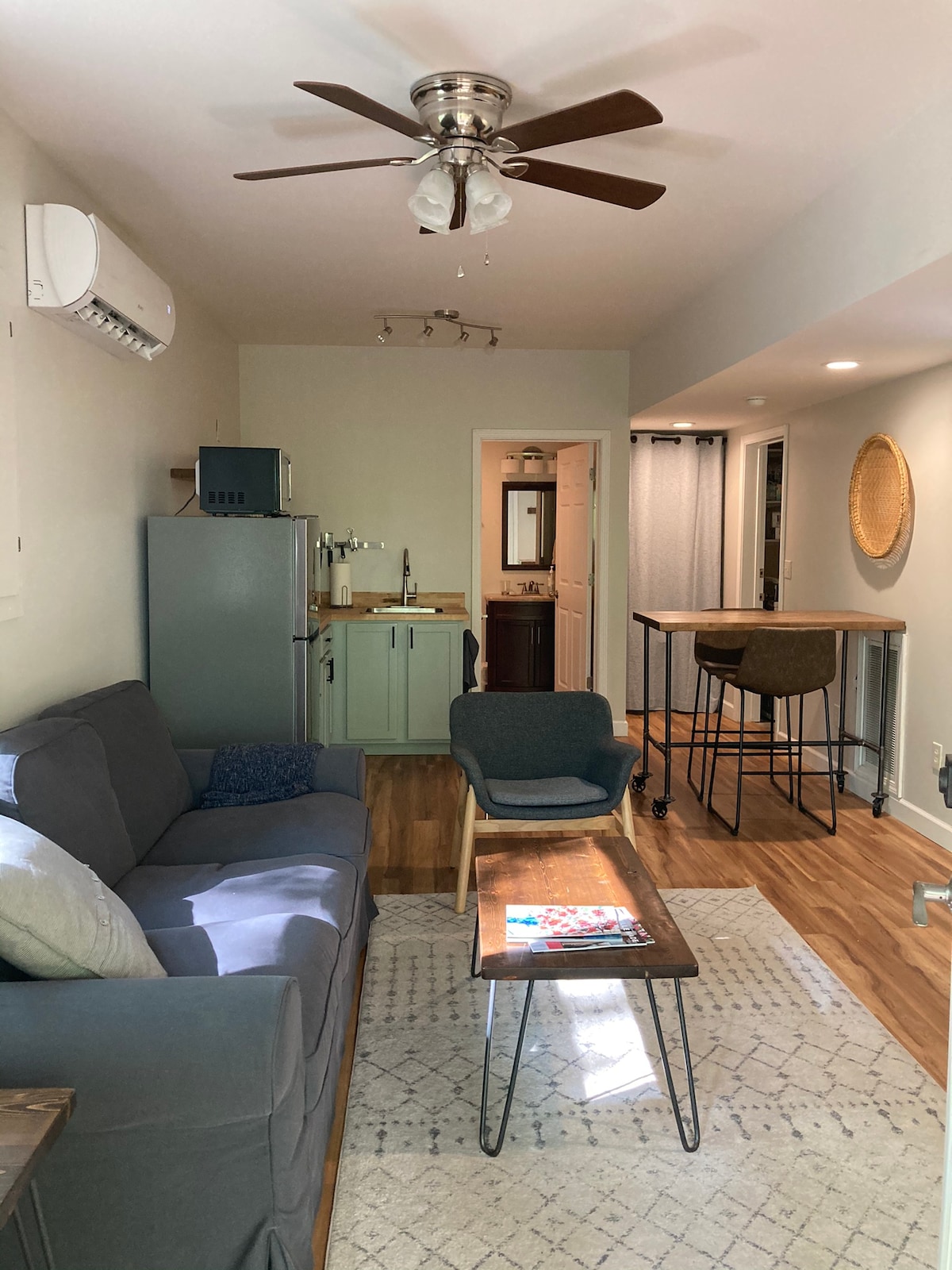 Simple in-law suite with easy in-and-out thru private, locking doors. One BR (with door), one small BA (stand-up shower, toilet, sink), open floor plan with living space. Complete kitchen (sink, stove/oven, dishwasher, microwave, full sized fridge), small HE combo washer/dryer. Bike/boat storage readily available (locked garage), bike/boat washing encouraged! Wooded backyard with native gardens and access to woodland trails makes for a serene setting - not your average overnight stay!