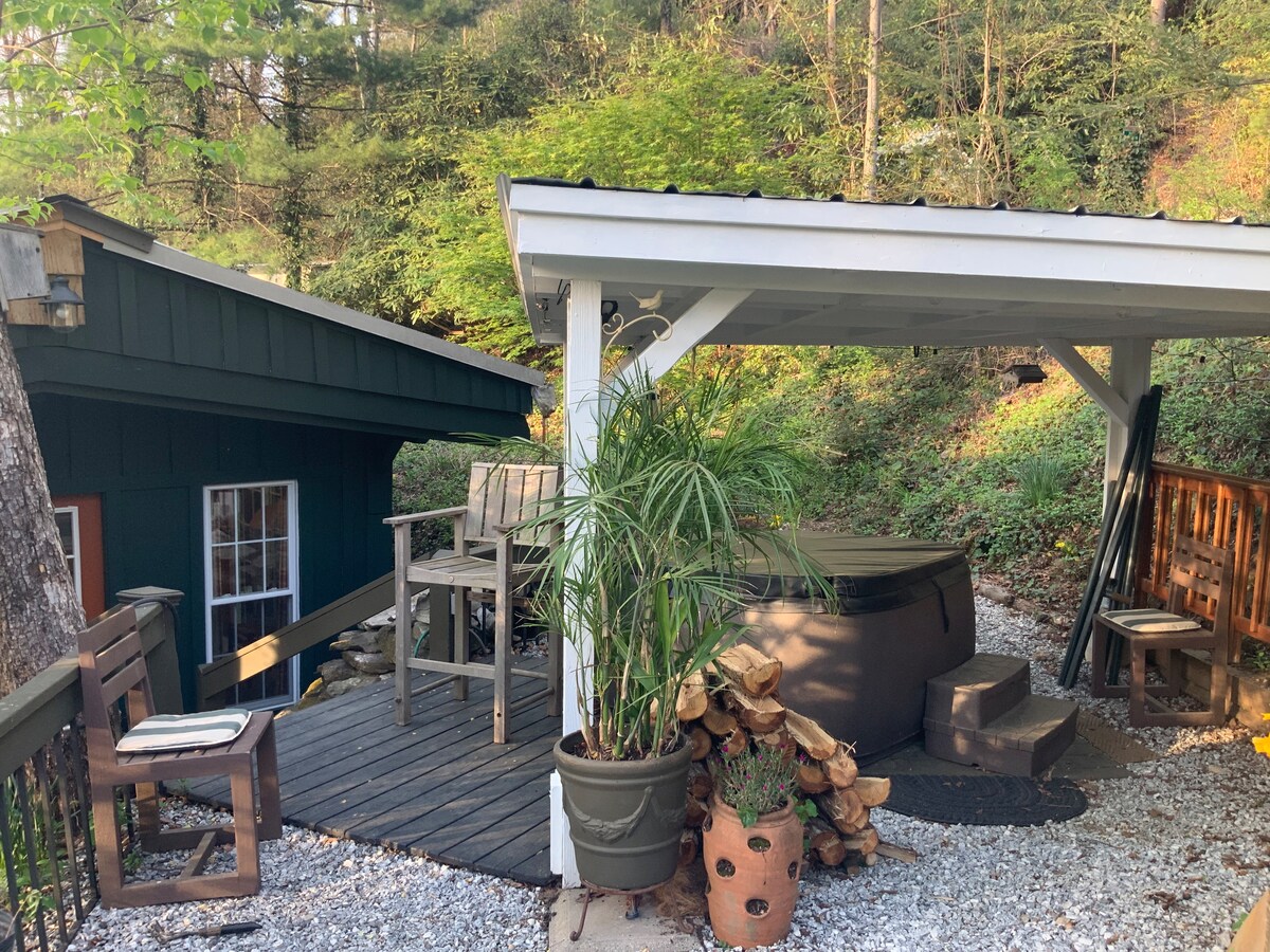 Welcome Home !This Unique and tranquil retreat bungalow , with hot tub . Sauna , comfy beds , Y'all will love the Blue Ridge mountains, , relaxing with steam and hot tub , fully equipped granite kitchen,hang by the frog pond cook out door ,fire place listen to music hang in hammock we are 50 miles southwest of Asheville. short term possibility This is a very private setting !Great place for bird watchers Hiking and Kyacking several good eateries, hookah longe, 420 friendly (outside areas)