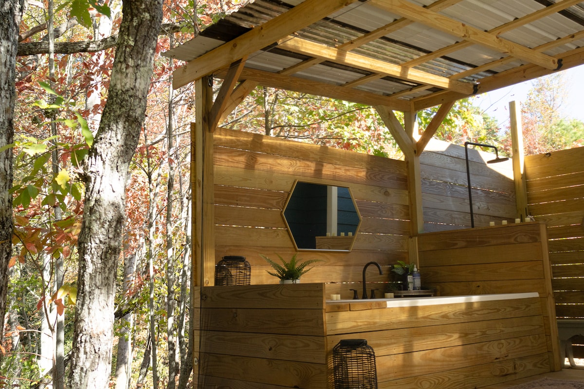 Bear Branch has a 32x32 in shower with instant hot water. Full size toilet, kitchen sink, microwave and k cup coffee maker. The lower twin size bed is perfect for a single travler or a cozy couple. If you need an aditional bed another twin mattress is a short climb away in the loft area. Outside the tiny house you can cook on propane and/ or a charcoal grill. Also have a stocked fire pit so you can enjoy a campfire. Firewood, bottled water, coffee and items to make smores are always provided!