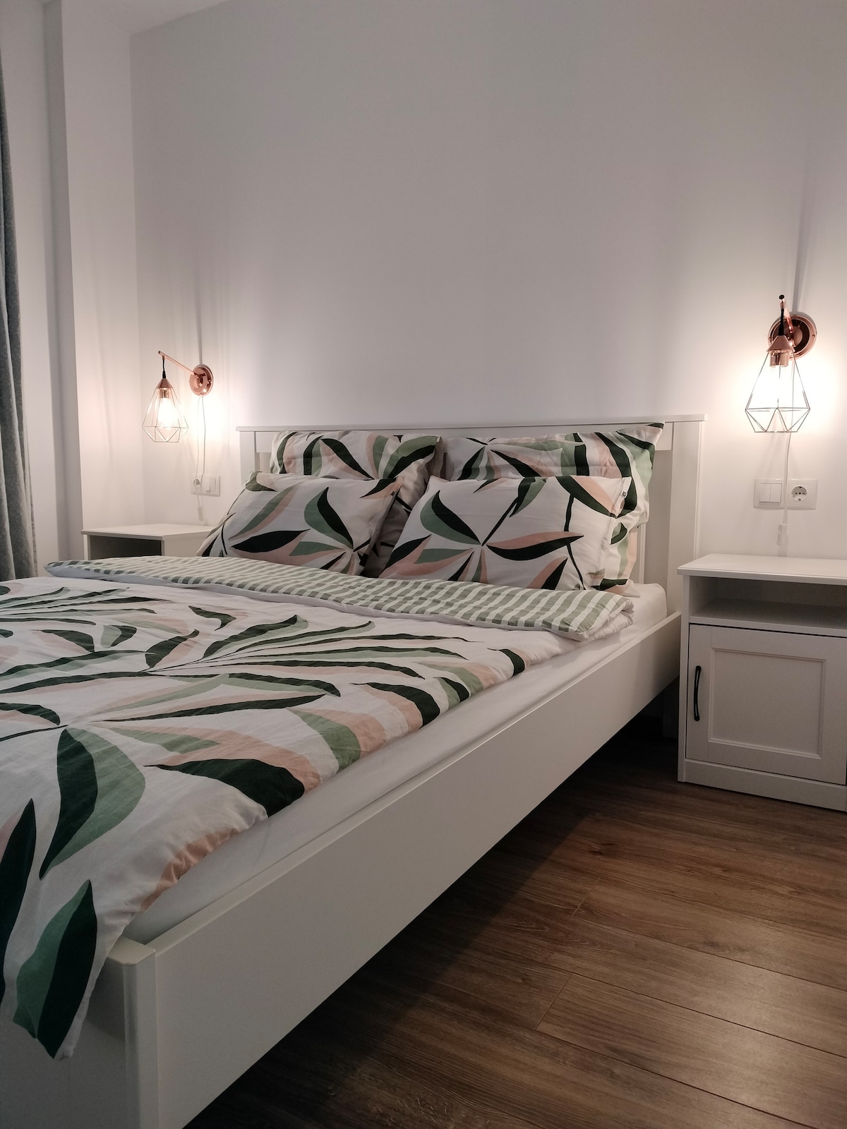 Descoperă acest apartament elegant, perfect pentru o escapadă în oraș, cu design minimalist și decor modern: • Living luminos cu canapea extensibilă și Smart TV cu cablu și platforme de streaming. • Dormitor cu pat dublu confortabil și proiector pentru seri de film. • Bucătărie complet echipată (frigider, aragaz, cuptor cu microunde, espressor, fierbător). • Baie spațioasă cu cadă și produse esențiale. • Balcon pentru momente de relaxare. Ideal pentru vacanțe sau afaceri!