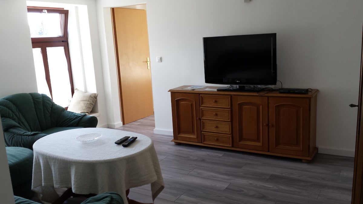 Die moderne 30 m² große Wohnung empfehlen wir für 2 Personen mit Kind oder 3 Erwachsene.Sie verfügt jedoch über ein Schlafsofa und ein Gästebett,wodurch die Belegung um 1 Person aufgestockt werden kann (auf Anfrage).Es erwartet Sie eine eigene Küche,ein Badezimmer mit Dusche und ein Wohn/Schlafbereich.Der Wohnbereich mit seinem Schlafsofa und dem Fernsehbereich bietet ausreichend Platz um entspannte Abende zu genießen.Schlafbereich ist mit einem Doppelbett und einem Kleiderschrank. ausgestattet.