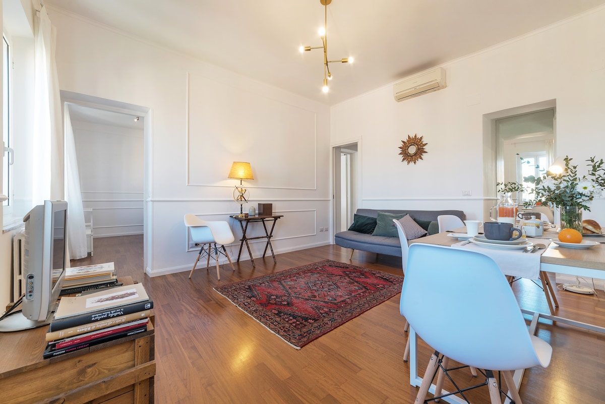 Slide open a striking copper door to reveal an airy living room with light wood floors and a powder blue sofa washed in natural light. High ceilings, clean accents, and understated design pieces give this flat its soft glow and stylish reticence. The flat is composed of a big living room that can be transformed in a second bedroom with a comfortable sofa bed (18 cm thick mattress), a dining/relax room with a nice kitchen and a master bedroom, the bathroom has a spacious shower. On entering the apartment, you will find the large living room divided by an open shelves bookcase and a large sofa bed that transform into a comfortable queen bed. Going forward you find the dining room with an open kitchen and a reading corner, at the end the master bedroom with a queen size bed and a bathroom with shower. The living room can be separated from the dining room thanks to a custom made sliding door transforming it in a second bedroom at night. the fully equipped kitchen features a gas stove, an oven, a fridge, a freezer, a dishwasher and all the necessary flatware and tableware. The apartment has all the comforts: high speed wifi internet, air conditioning and a dishwasher in the kitchen. You will have access to Netflix and Amazon prime video. At the check in i will suggest best restaurants around frequented by locals and cool things to do in Rome. Trastevere is one of the prettiest neighborhoods in Rome with its narrow cobblestone streets, colorful buildings dripping with ivy, and balconies enlivened with geraniums. Trastevere is relaxed, and has far less traffic than other parts of chaotic Rome. It feels more like a small town than a capital city.