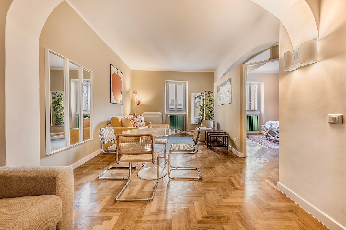 Elegant and renovated apartament located in the Trastevere heart: 2 rooms, ( 1 double and the other as you like double or 2 single beds ), livingroom with sofa bed, fully equipped kitchen, 2 bathrooms ( 1 in the bedroom with tub, the other with shower ) Suitable for families/groups up to 6 people .