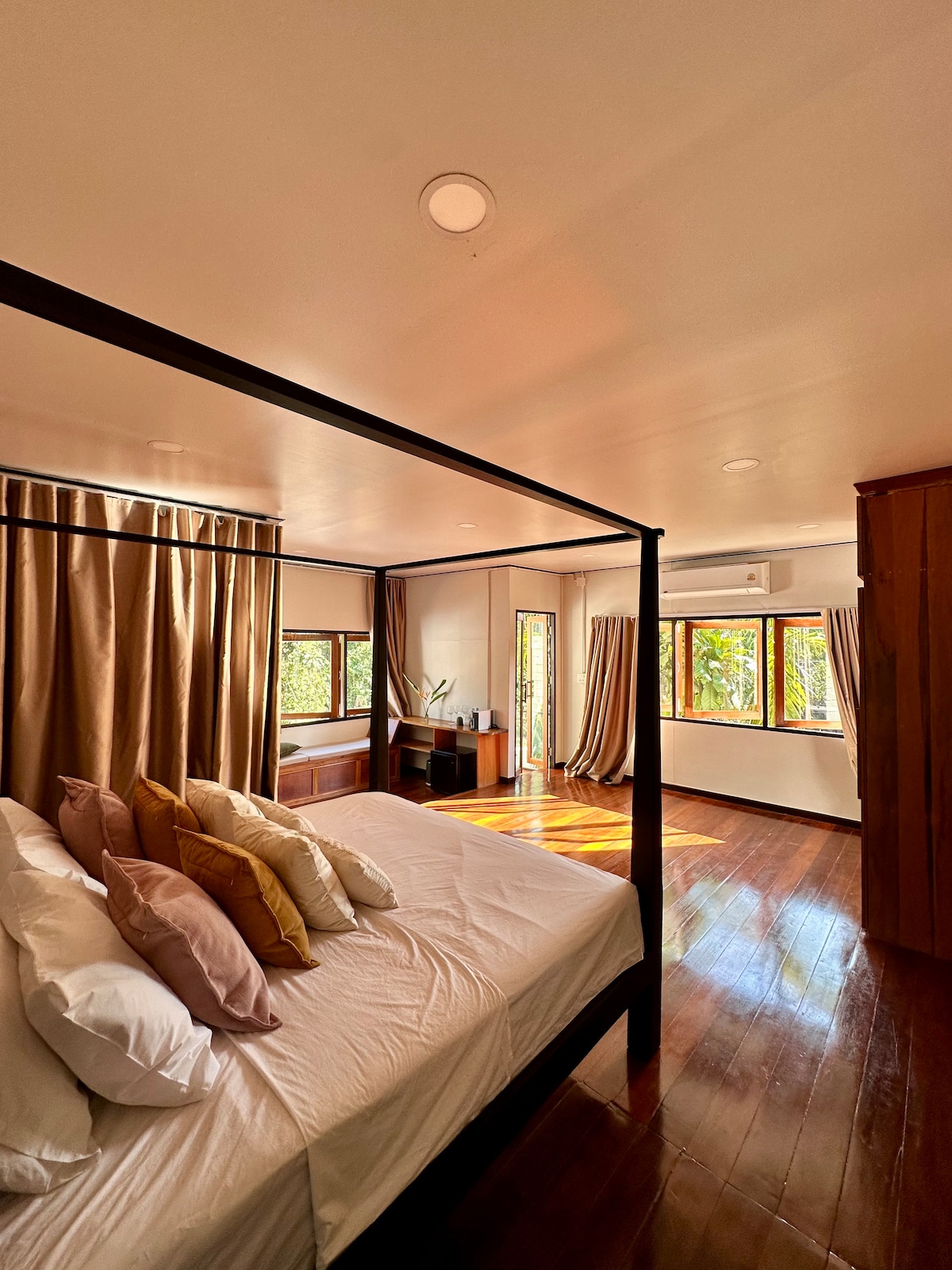 Dans un jardin tropical avec piscine et une grande terrasse, vous pourrez profiter de ce bungalow indépendant équipé d'un lit King Size, d'un climatiseur, d'un bureau, d'un coffre fort, d'une bouilloire et d'un mini réfrigérateur. La salle de bain privative dispose d'une douche à l'italienne très spacieuse, d'un lavabo et d'un WC. La terrasse couverte est idéale pour profiter de la vue sur le jardin, et entendre le chant des oiseaux.