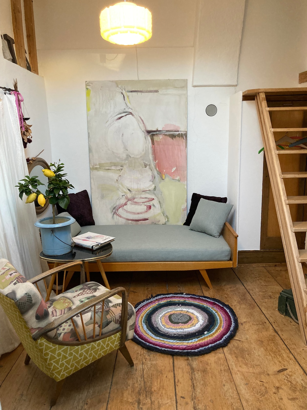Hier findest Du eine schöne helle Studio Wohnung.Die Giebelseiten sind verglast und mit je einem Balkon bestückt.In der Wohnungsmitte befinden sich noch zusätzliche 10 Dachfenster die für ein angenehmes Wohnklima sorgen. Das Badezimmer ist mit einer Duschkabine mit Regenbrause, Waschbecken mit Spiegel und WC ausgestattet. Zum Schlafen steht ein Bett 140/200 und ein Schlafsofa zur Verfügung.Das Bett ist optisch durch ein Fadenvorhang vom restlichen Raum abgetrennt. Die Küche ist voll ausgestattet mit allem was man so alltäglich brauchtAn den Koch und Essbereich schließt gleich sich die gemütliche Fernsehecke und auch die Leseecke an.