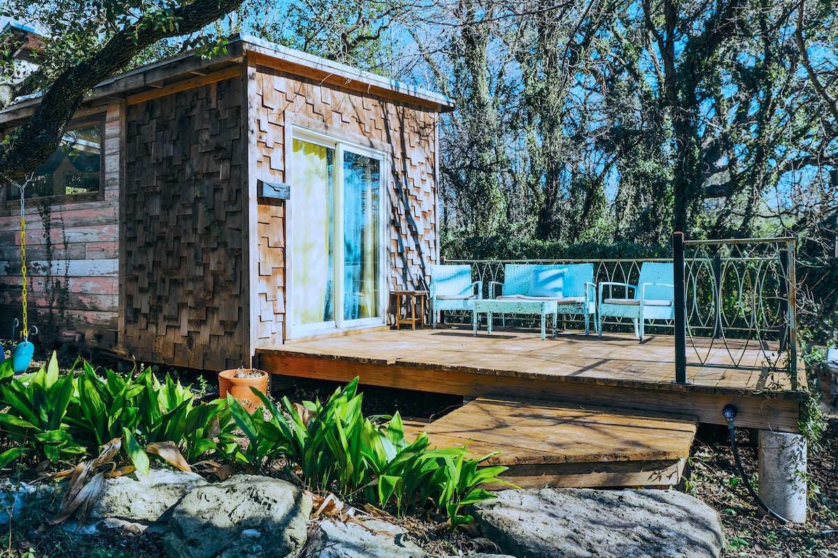 Stay with us in our beautiful modern cabin at Eco Ranch. Relax on 85 acres of beautiful Texas Hill Country just 18 miles from downtown Austin. This private modern cabin offers 350 sq ft with a queen bed, full kitchen, full bathroom, and cozy living space. Enjoy a shared pool, walking trails, disc golf, seasonal orchard, and visits with goats, chickens, emus, and roaming deer. Quiet, private, and surrounded by nature, yet close to Austin’s dining, music, and nightlife.
