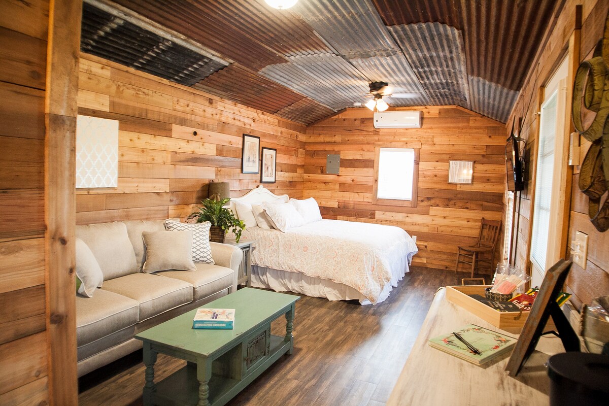 Based on the Southern “dog trot” design with the living space separated from the sleeping quarters by a breezeway, each of these cabins is a standalone 400 square foot unit featuring a comfy queen bed & sleeper sofa. Each cabin has heat/AC, microwave, mini fridge, coffee maker & assorted coffees, hairdryer, iron & board, and a walk-in shower. Linens & towels are provided. Each cabin is non-smoking. Wifi available in the room. Pets are allowed in some Cabins with a $150 fee per pet.