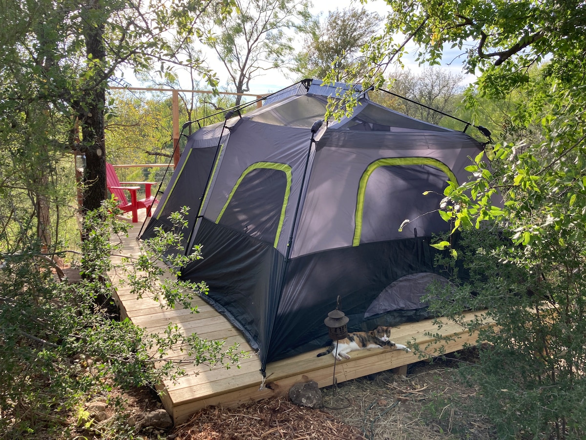 The Grand Tesoro tent at Talula Mesa Glamping Resort (1 of 4 tents here) Hot tub recently added! Ultra-comfortable Glamping in a hybrid tent/cabin (with AC and heat) = the ultimate getaway. We've supplied everything you need - paddleboards, kayaks, yard games, an outdoor movie station, fire pit, grill, refrigerator, coffee, hammocks, yoga mats and more. Big views of the hill country and Lake Travis greet you at every turn. Lake Travis access - 2 min away. Flat Creek Winery - 10 mins