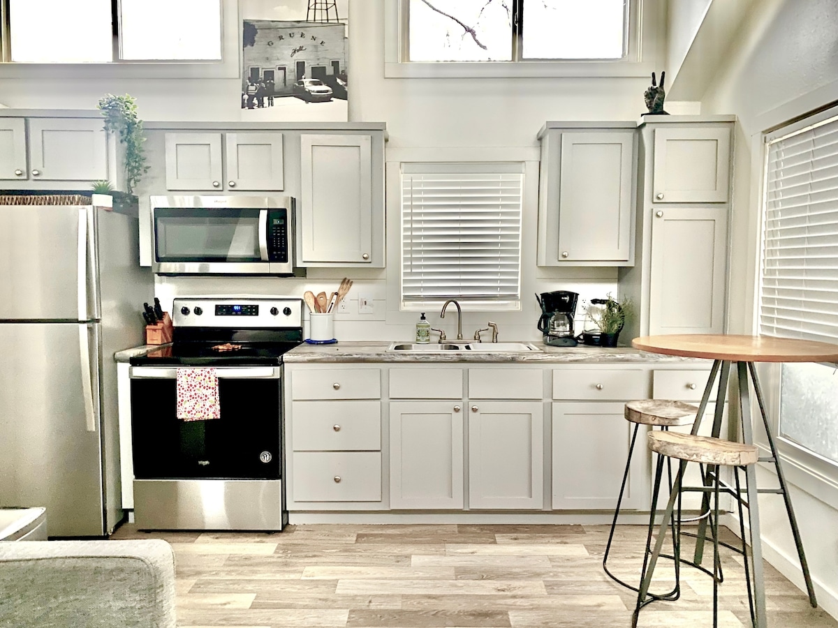 Tiny House Big Personality may be very modest in size, but charisma abounds. . This Tiny house has all the amenities to make you feel like you're truly on vacation. Enjoy the fully equipped kitchen. Cute yard with an outdoor dining area. Lounge in bed with the ultimate 'netflix and chill" projection screen that scrolls down with an easy press of a remote. Plus a full size bathroom with a super roomy shower (more than big enough for two). Close to UT, dining, bars, and great things ATX!