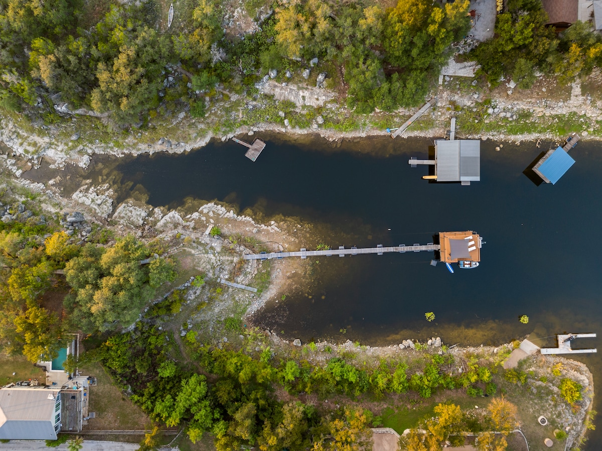 Luxury cabins two blocks from Lake Austin & world renowned spa. Both cabins are yours! Perfect getaway for a group of 8 with sprawling decks, large backyard with cowboy pool, fire pit, Blackstone grill, playground oasis for the kids & corn hole all on football turf. The entire property is yours to enjoy during your stay. The space is very private & has an inviting vibe. Each room has smart tv's, memory foam mattresses & fast wifi. Rent a boat or bring your own and enjoy beautiful Lake Austin!