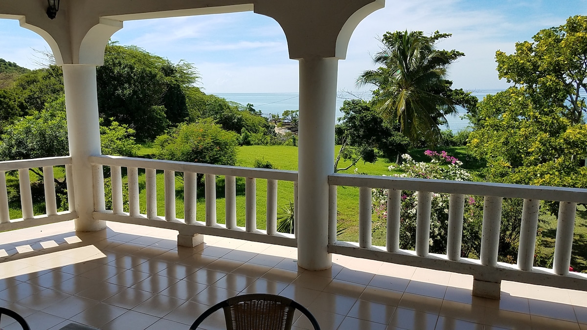 Seaside Villa is a spacious 7-bedroom, 7-bathroom home in Treasure Beach, Jamaica, with A/C in every room and hot water. Enjoy stunning ocean views from 3 balconies and 3 walkout terraces, surrounded by lush coconut trees and tropical flowers. The villa includes 2 kitchens, separate living areas, a large backyard, a private pool, and 2 gazebos. A spiral staircase leads to the pool. Less than a 2-minute walk to the beach & 1 minute to Lashings Beach Club for a perfect tropical retreat.