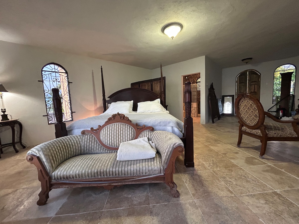 This charming villa room has high ceilings, oversized hand crafted windows, custom double doors and a covered screened porch which adds a comfortable living area great for remote work or just observing the doctor bird floating from flower to flower. The plush queen bed and newly renovated en suite bathroom make this cozy space a dreamy beachside home. This cottage is fan cooled with Hot water shower. Ideal for weekends away or a solo traveler.