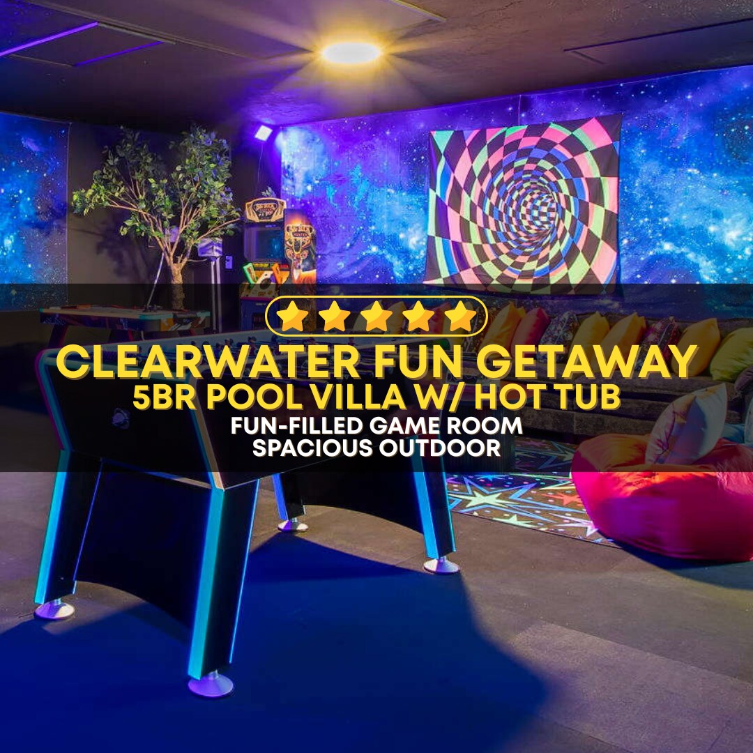 Welcome to your private, tropical escape! Unwind by the solar-heated pool in a screened, mosquito-free lanai. FUN & GAMES: Enjoy Billiards (Pool Table) 🎱, Foosball, Cornhole, board games, and 3 Smart TVs 📺. PRIME LOCATION: Only 5 min 🚗 to Indian Rocks & Bellaire Beach, FL Botanical Garden, and dining. Essentials: 🌞 Heated Swimming Pool (Private!) 🎮 Billiard Table / Foosball Table / Cornhole / Boardgames and more! 🛏️ 4 Queen/Full Beds 🧺 Beach Amenities