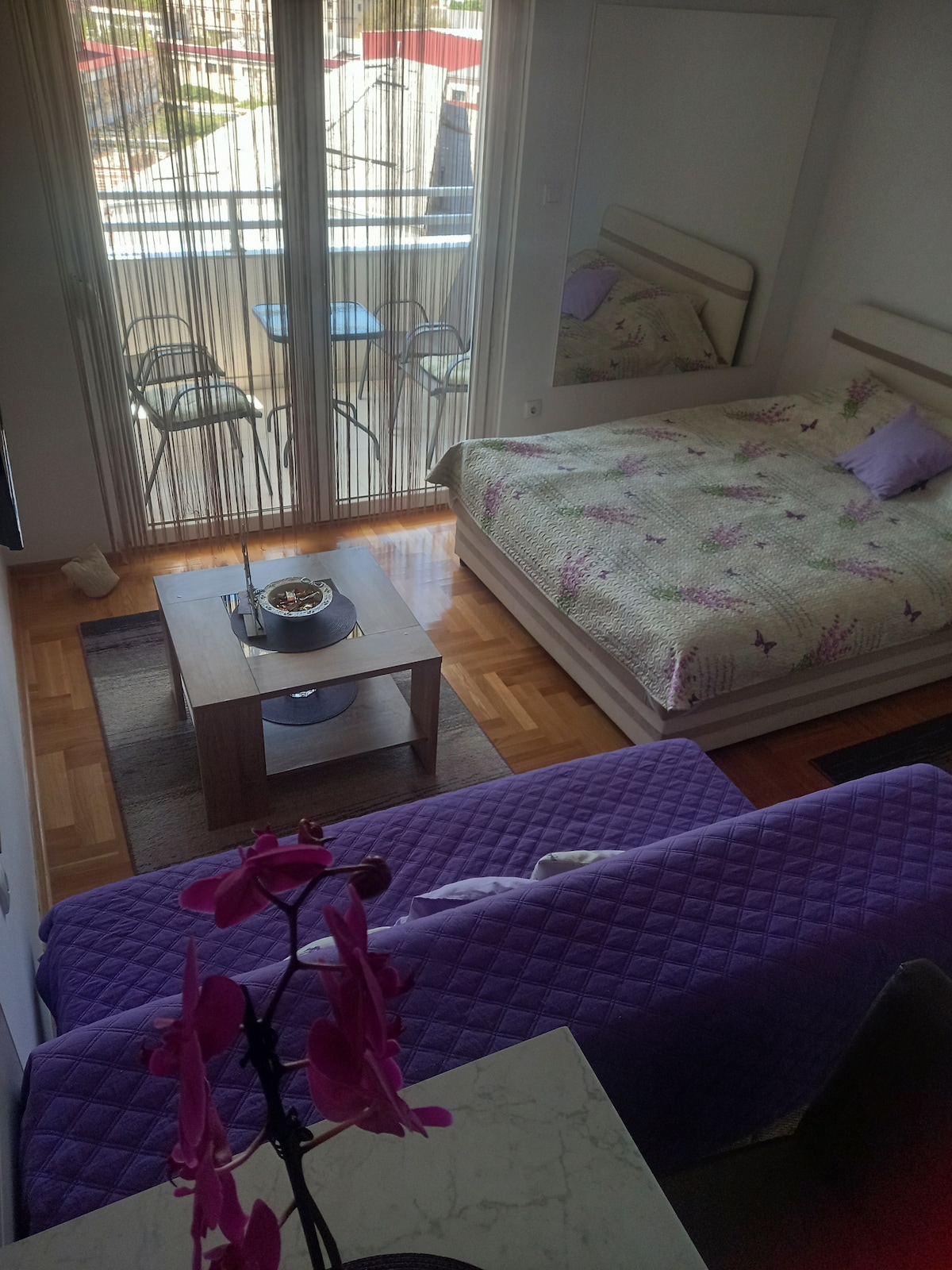 Apartment is situated on a quiet street with a spectacular view. It is comfortable for two, but also has aditional bed in the living room. Beach, restorant, bus station, store and tennis courts are just 3-5 min walk. The distance from the Old Town is 15-20 min walk.