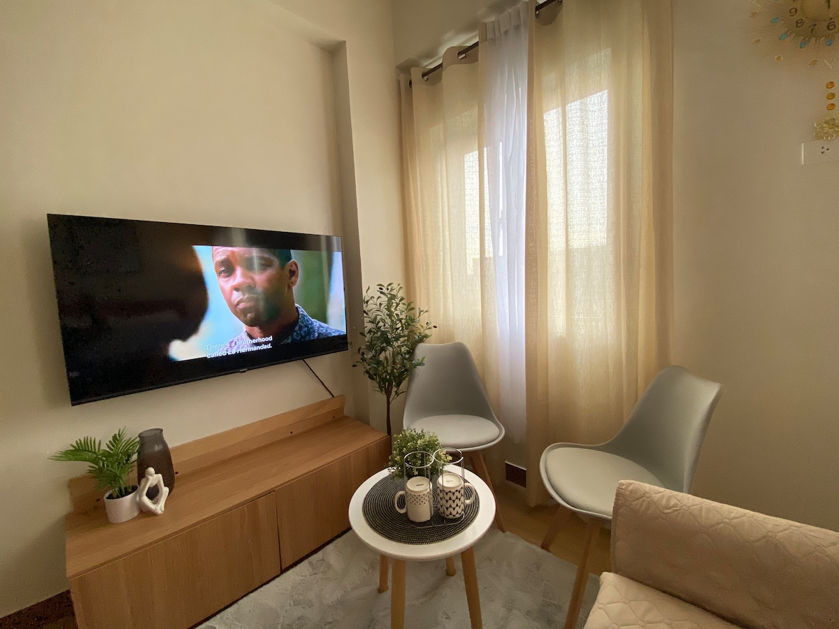 HappyStays#2 is a corner - 30sqm condo, w/ loft bed which makes it even more spacious. Enjoy BED CINEMA on our large 65" TV connected to fast 300mbps wifi, with Netflix, HBO, Prime & Disney! Window view from the 6th floor is the beautiful skyline and lush greeneries. It has 3 beds (queen bed sofa bed and loft bed) & complete kitchen amenities. It has washing machine and electric water dispenser (w/ 3 round water gallons) for maximum homey convenience. It is located beside SM Mall.