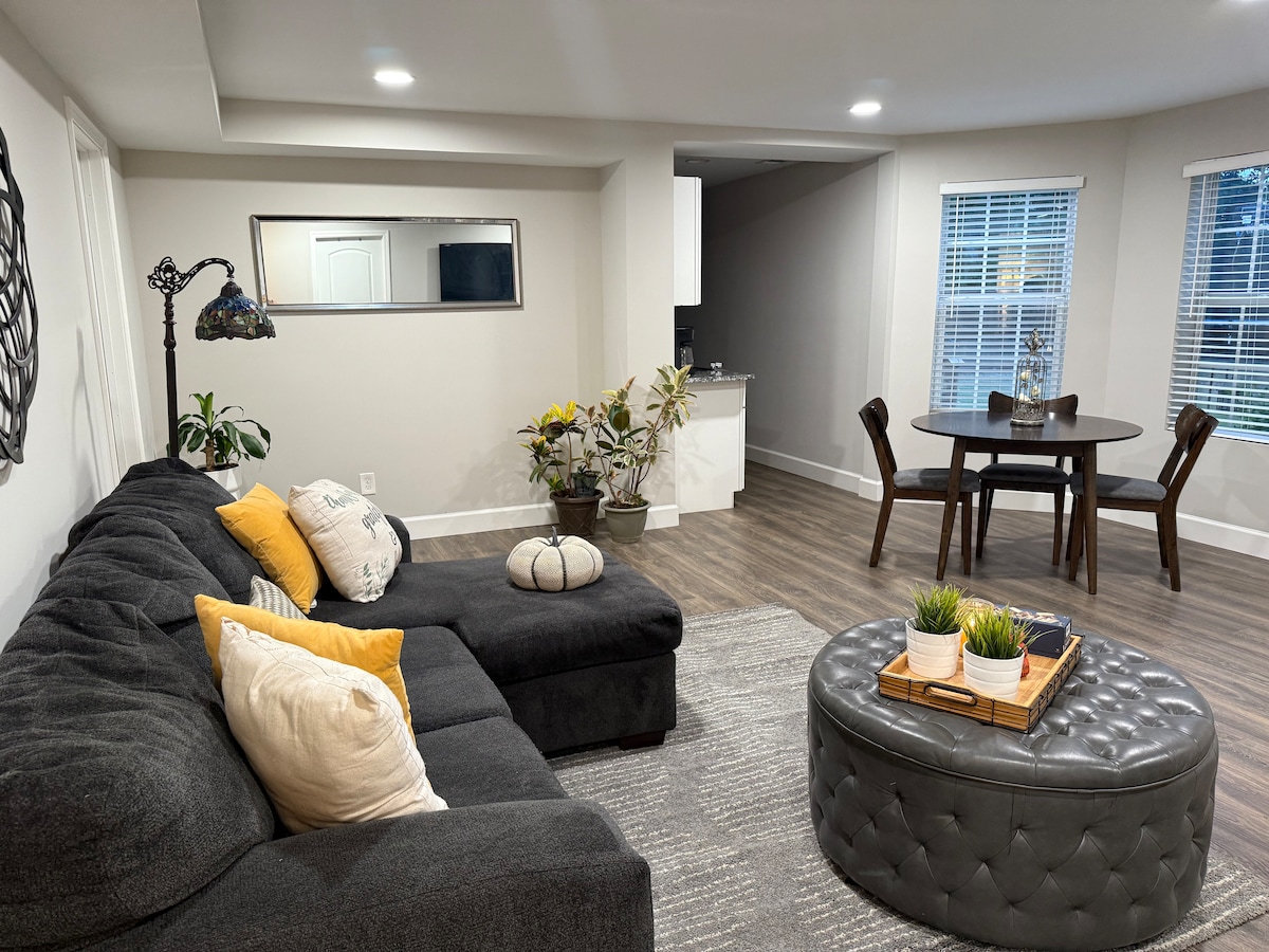 Welcome to your serene 1385 sq ft basement apartment with your private entrance & parking. You can enjoy the beautiful outdoor space overlooking the trees and creek. There is a lovely living/dining room with a 65" Smart TV, spacious bedroom, dressing room office combo, laundry room, kitchenette with an 8-in-1 oven, full refrigerator, and induction cook plate, and coffee maker. You will find a well-stocked kitchen with pots & pans, dishes & tools. There is a bonus bedroom with two twin beds.