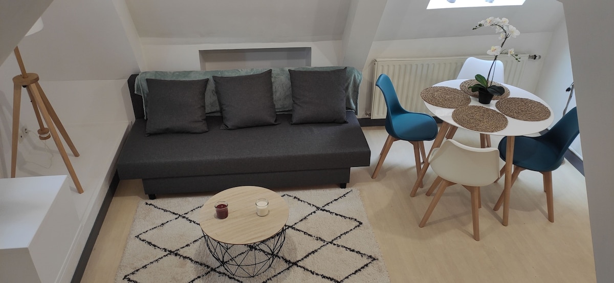 Maisonnette cosy pleine de charme. A l'étage : chambre avec 2 lits jumeaux (90 x 190 cm), petite commode et penderie. Au rez-de-chaussée : séjour avec poêle à bois, canapé-lit (système rapido avec un vrai matelas très confortable), vaisselier, commode + TV, tables; cuisine avec réfrigérateur, 2 plaques de cuisson, four combiné, cafetières tassimo et à filtres, toasteur, bouilloire électrique, mixeur plongeant, rape à légumes électrique; salle d'eau : douche, bloc lavabo, WC, lave-linge
