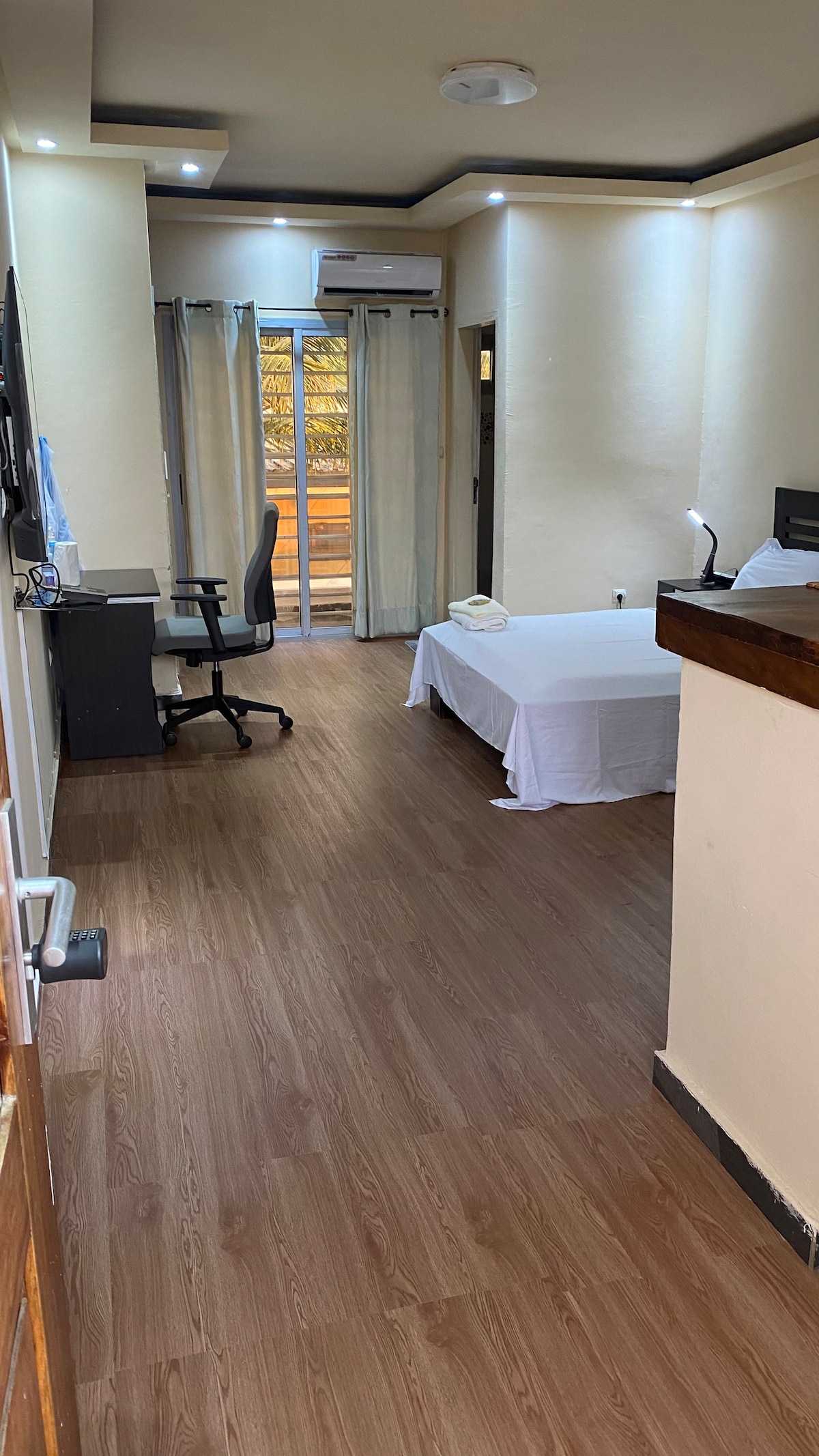 Beau studio sécurisé avec gardien de jour et de nuit.Accès facile Rez de Chaussée avec ouverture sur une petite terrasse. il dispose d'un grand écran de 55 pouces, un coffre fort, une enceinte Bluetooth avec un son de qualité Harman/kardon, un lave-linge, un fer à repasser , Robot aspirateur , assistant Vocale connecté , purificateur d'air et autres équipements. Le sol de la chambre est vêtu d’un parquet flottant