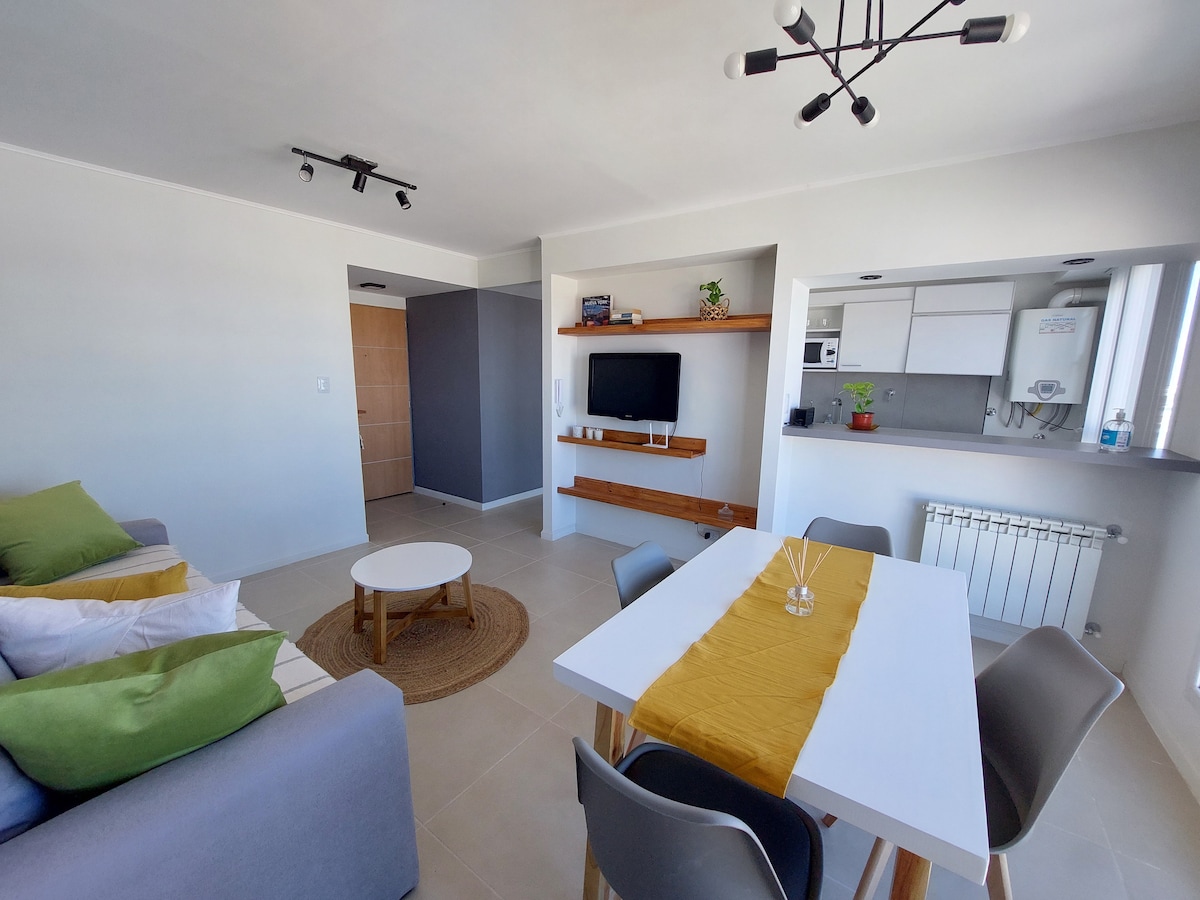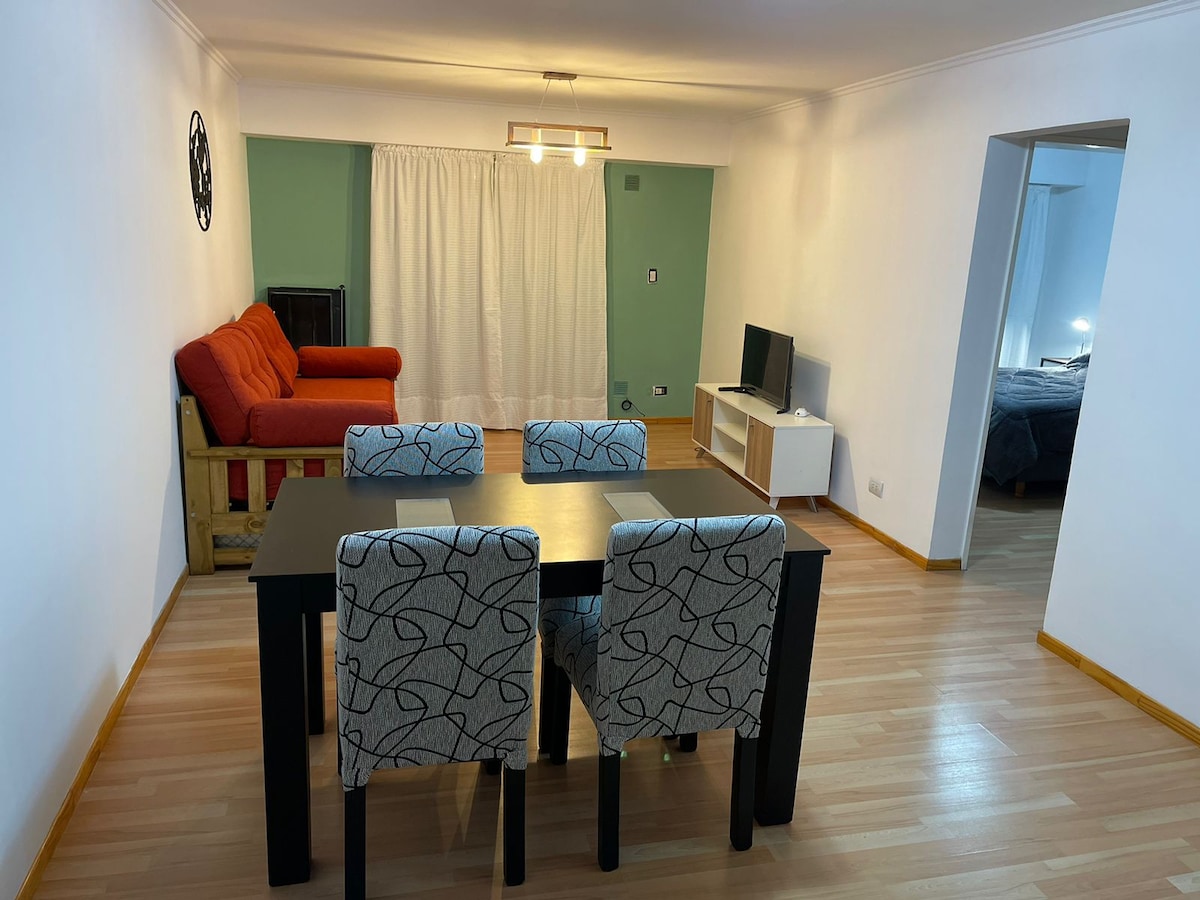 Departamento en planta alta mediante escaleras totalmente equipado para que en tu viaje vacacional o laboral no tengas que preocuparte por nada. Súper cómodo y luminoso. Ideal para cuatro personas, cama doble y dos camas simples. Se encuentro en pleno centro, a metros del Bar Antares.