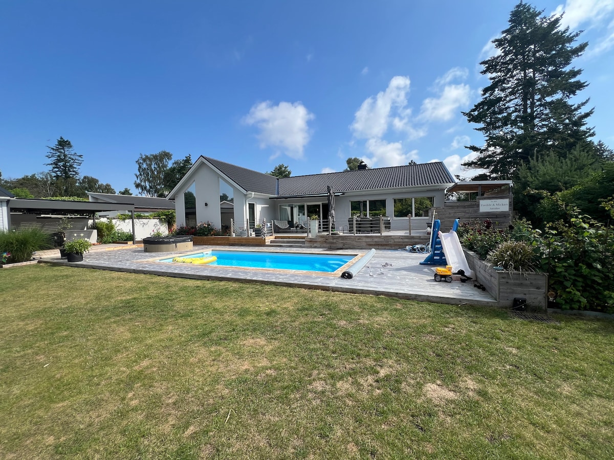 Our beautiful, spacious pool villa is ideal for families and groups of friends looking for a relaxing holiday in stunning Skåne. Enjoy a great little neighbourhood close to big cities such as Copenhagen 40 minutes away and Malmö 20 minutes away. Furthermore, the house is located very close to some of Sweden's best beaches e.g Skanör-Falsterbo which is only 12 km away. 4 bedrooms in total with 2 double beds, 1 sofa bed, 1 toddler bed, and one mattress.