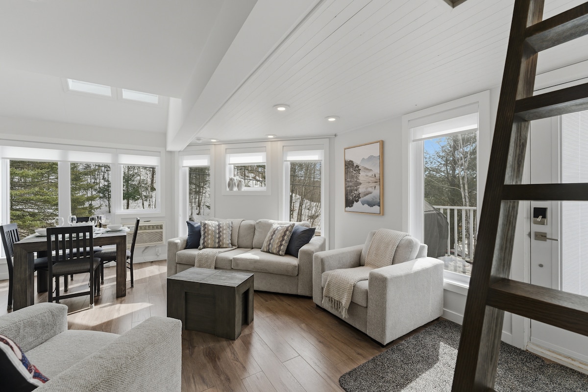 Newly renovated (2023) ski-in ski-out 2-bedroom condo in La Chouette in the heart of the pedestrian village - drive up and leave the car (free parking). Smart TV, High speed internet, Netflix. Comfy bedding and towels and luxury toiletries provided. Professionally cleaned. Fully stocked kitchen with all new stainless steel appliances. AC in summer with south facing deck. Electric fireplace and heated floors with barn board accents for style. Ski locker and laundry facilities steps from door.